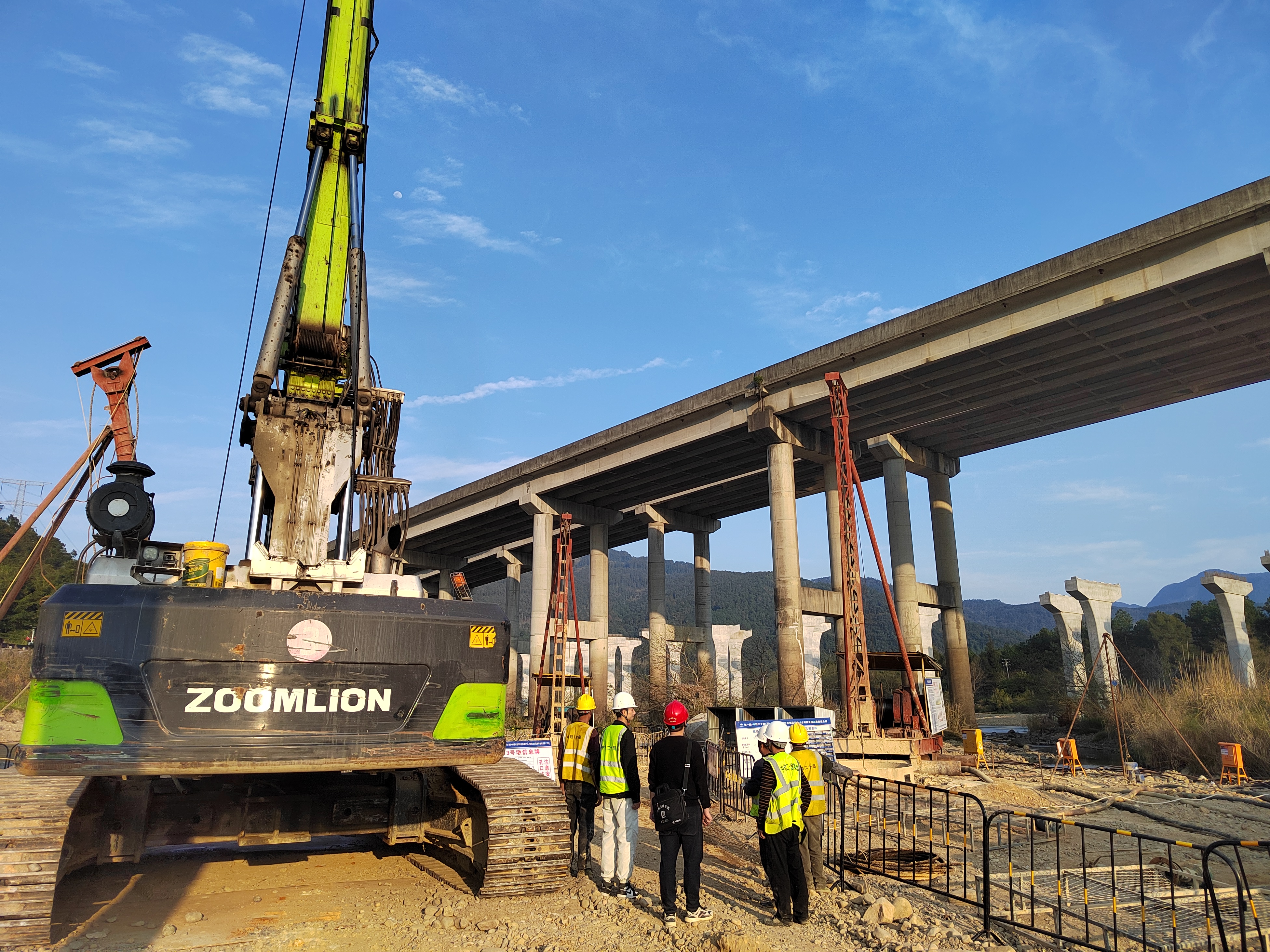 面对复杂的地质与施工环境,项目团队坚持“科学攻坚、精准施策”原则,根据不同地质条件与水文特点制定差异化施工方案。针对岩层钻进难题,项目创新使用“三步成孔法”施工工艺,通过“1.25m旋挖钻掏心、1.5m牙轮钻钻取中环、1.8m牙轮钻磨取外环成孔”三步循环,有效提升了复杂地层的施工效率;针对水中桩基施工,则依据水深灵活采用筑岛或搭设作业平台,确保作业安全与成桩质量。通过动态优化技术方案、强化安全质量管控,项目成功克服一系列难题,为桩基工程全面完工提供了坚实保障。